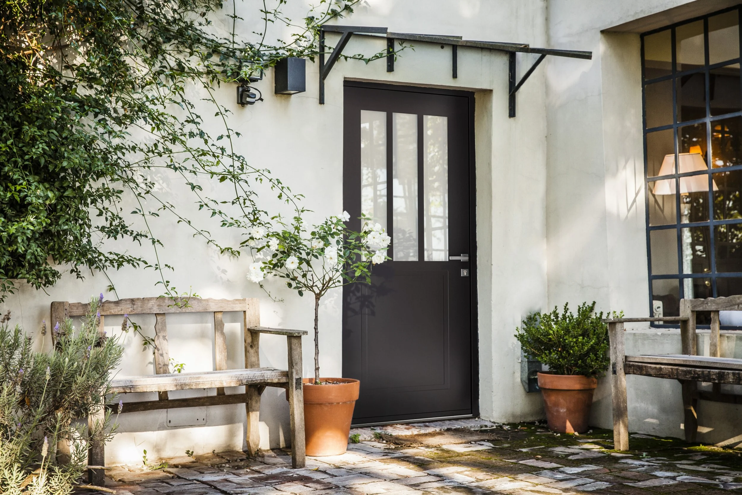 Accessoires : Poignées design, Grille en fer forgé, bâtons de maréchal, boîte aux lettres intégrée.