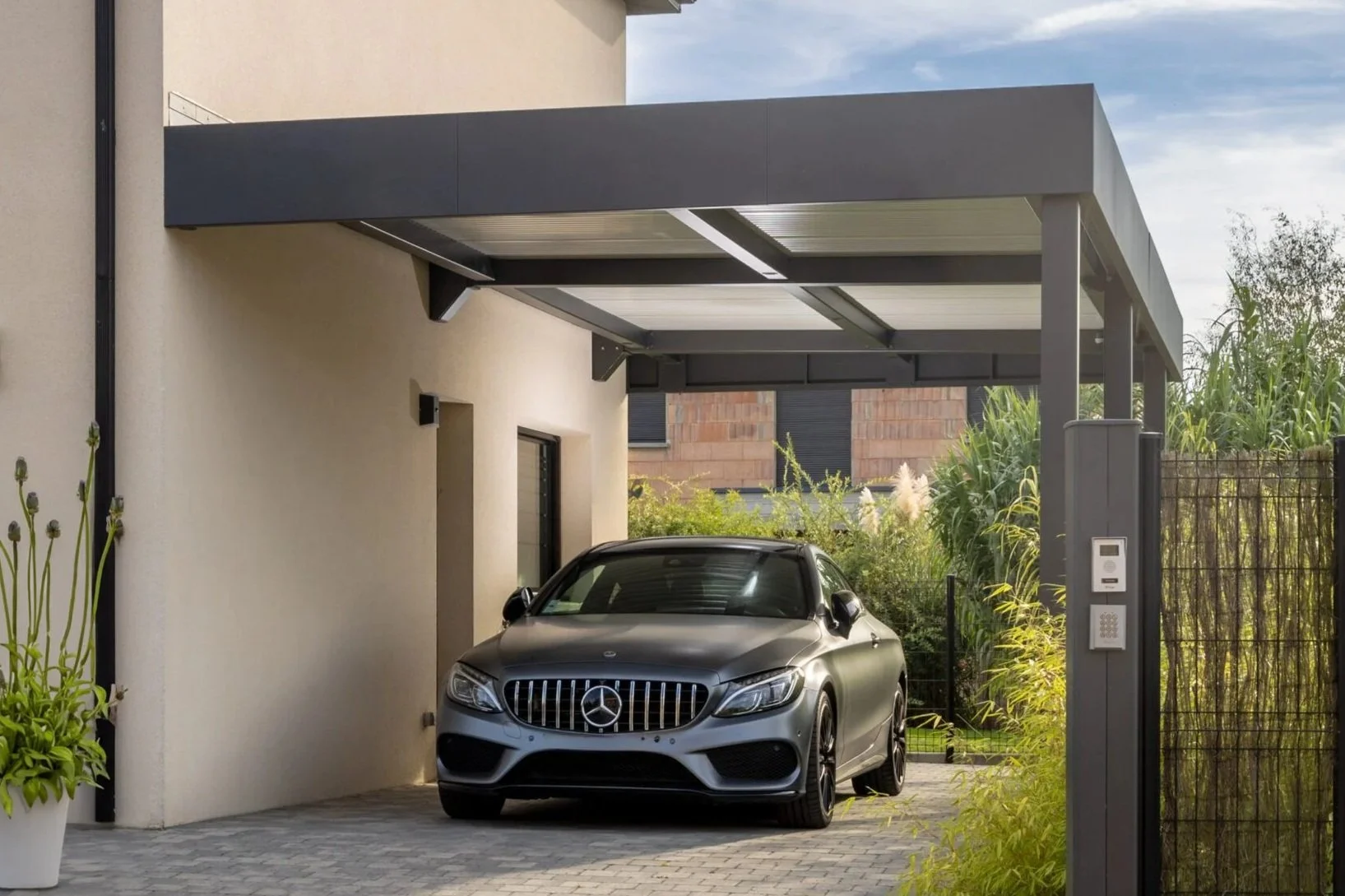Fixé sur la façade de votre maison, il prolonge naturellement votre architecture. Il est idéal pour créer un passage au sec de la voiture à la porte d'entrée.